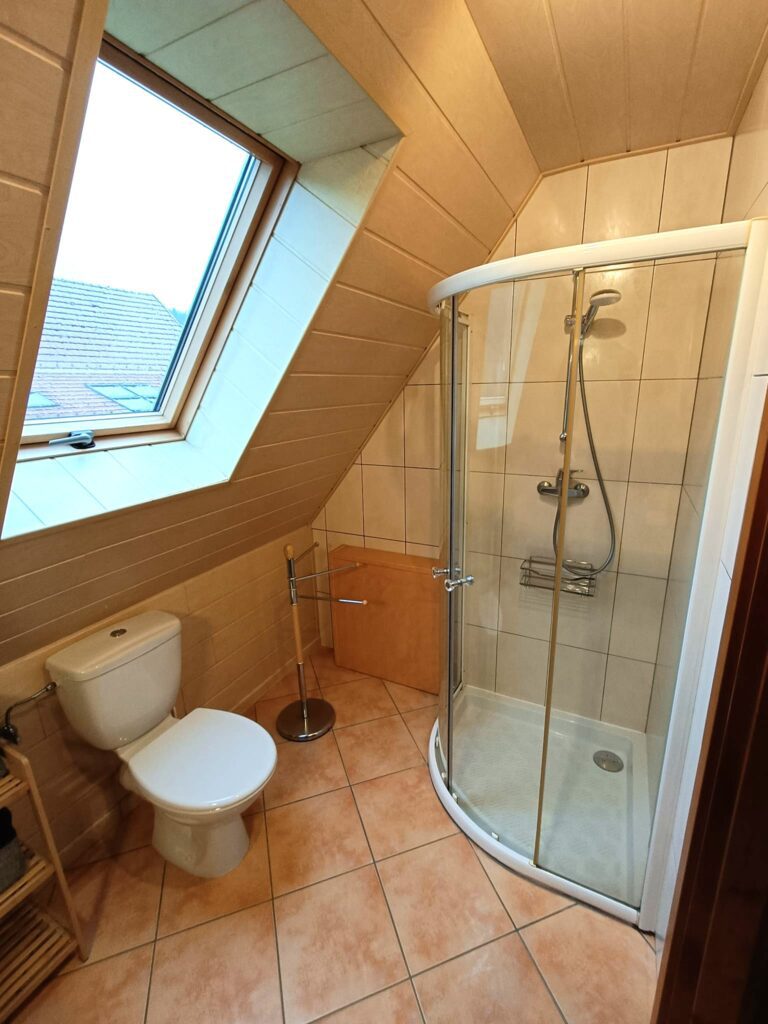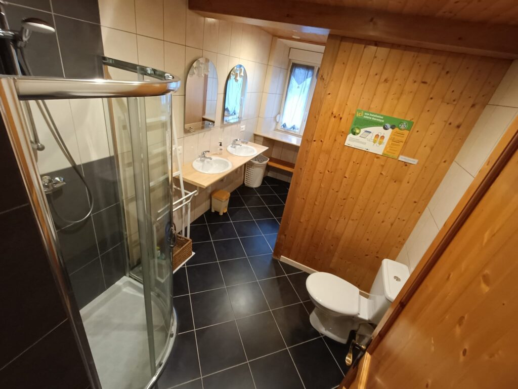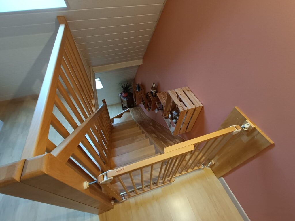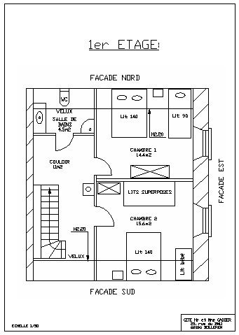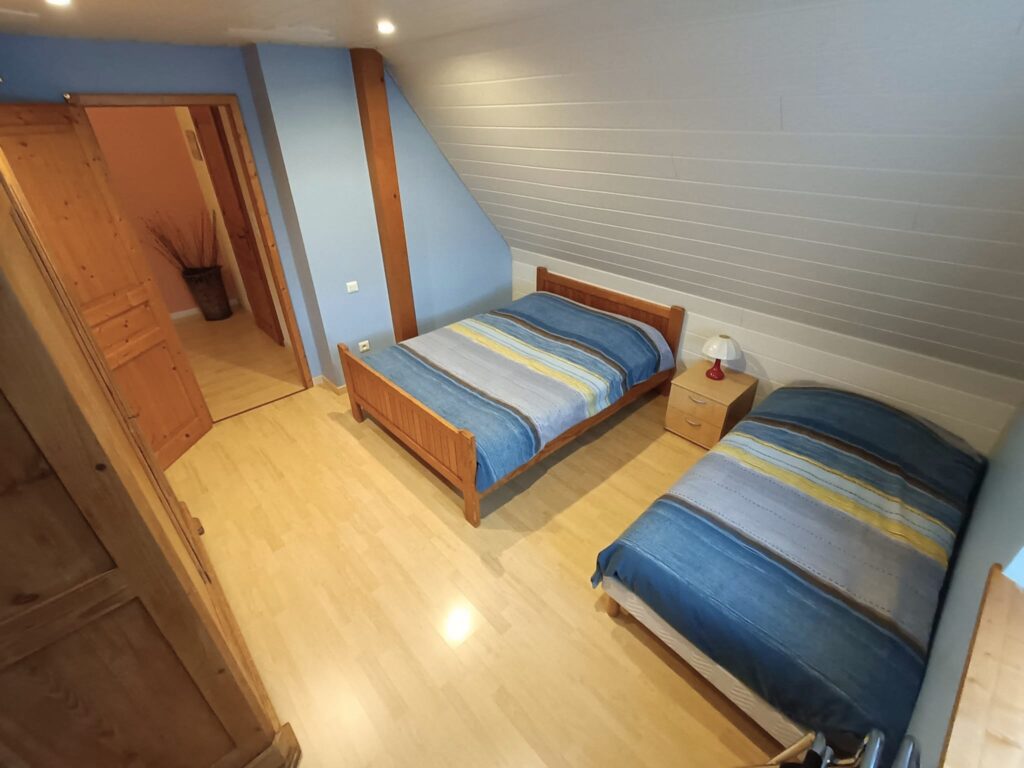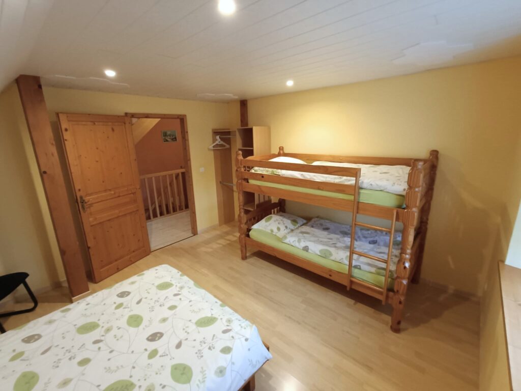 - Au 1er étage : 2 chambres (chambre 1 avec lit de 140 et 1 lit de 90, chambre 2 avec 1 lit de 140 et 1 lit superposé). Salle d’eau et WC.
