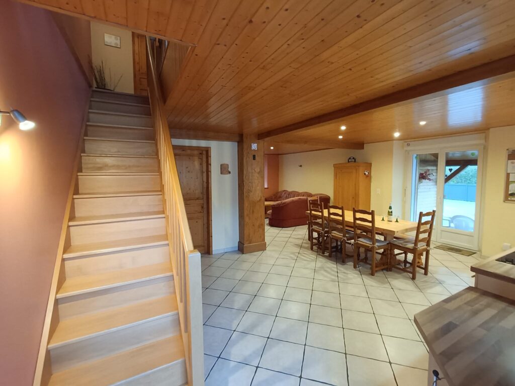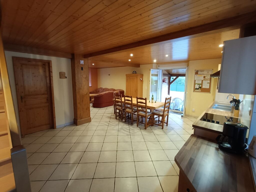 - Au rez-de-chaussée : grand séjour ouvert sur la cuisine équipée. Salon avec grand canapé (possibilité convertible 2 places). Salle d’eau et WC.